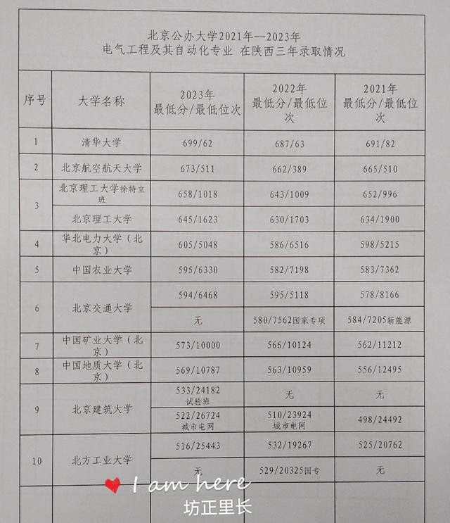 北京地区高校2021年~2023年 电气工程及其自动化专业 在陕西录取最低分数线及位次